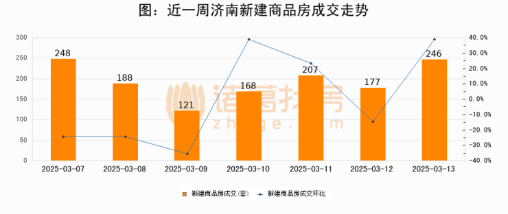 根据济南市住房和城乡建设局数据显示,2025年03月13日济南新建商品房成交246套,较昨日增加69套,环比上涨39%