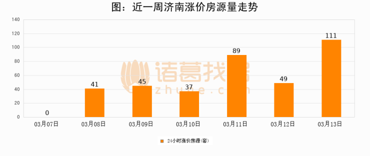 根据诸葛找房数据显示,济南24小时涨价房源量为111套,较03月12日增加62套,环比上涨126.5%。与此同时,涨价房源占比小幅扩大,业主信心有所提升。