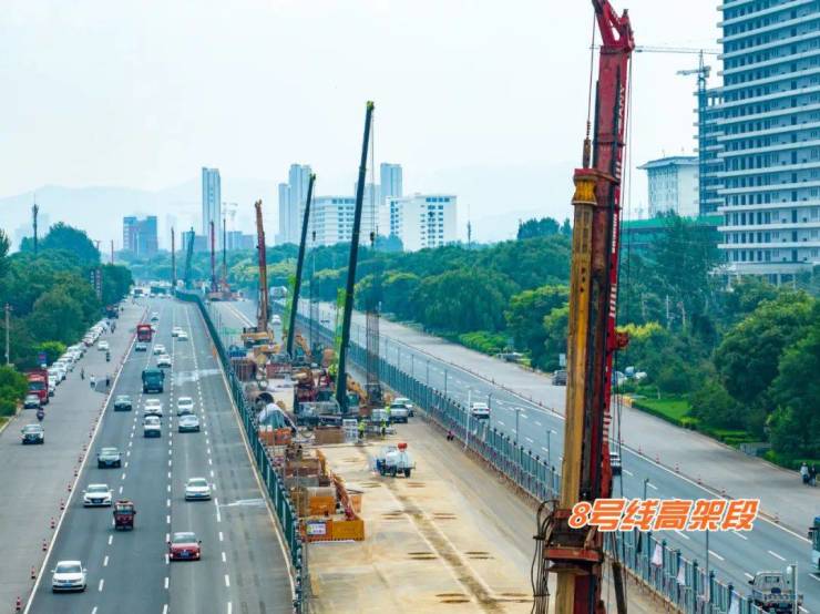 8号线一期工程两座地下站已进入基坑开挖阶段;高架段桩基、承台、墩身施工并行推进,目前已完成墩身浇筑4个;全线U梁完成浇筑117榀;车辆段已完成综合楼桩基施工。