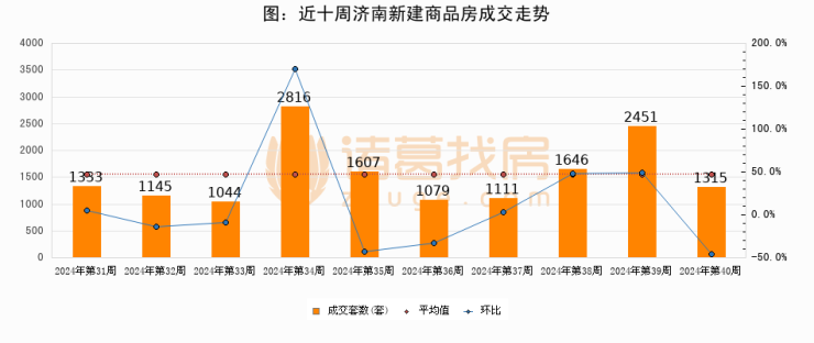 进入2024年第40周(09月30日-10月06日),济南新建商品房成交1315套,较上周减少1136套,环比下降46.4%