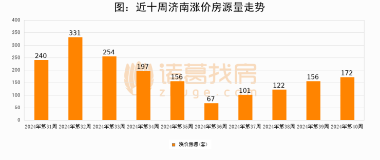 从调价房源来看,第40周济南涨价房源172套,较上周上涨10.3%。与此同时,40周涨价房源占比提升5.84个百分点,业主信心持续恢复。