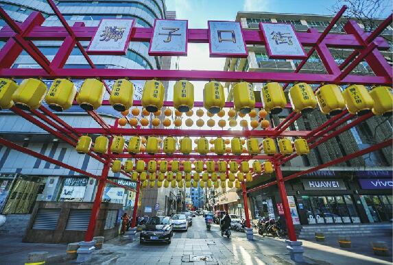 在两条街巷的北口,新建了框架式的标识性装饰物,其中旧军门巷的新“门框”为蓝色,悬挂有泉城著名景点的标牌,整体造型富有现代时尚气息;狮子口街的新“门框”为红色,悬挂有上百个黄色的圆珠和灯笼,展现出浓郁的中式风情。
