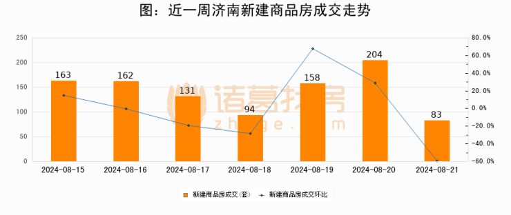 根据济南市住房和城乡建设局数据显示,2024年08月21日济南新建商品房成交83套,较昨日减少121套,环比下降59.3%。近一周济南新建商品房日均成交143套。08月21日单日成交83套,低于近一周平均水平42%。