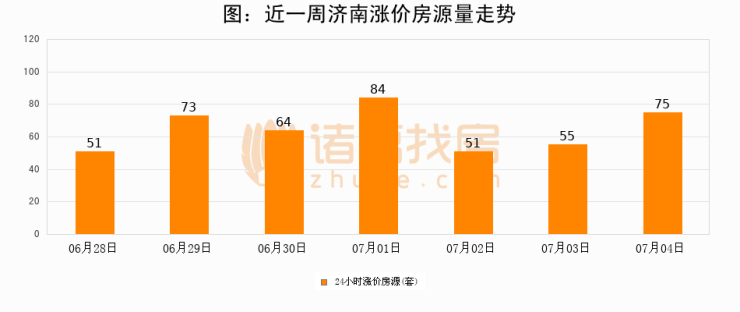 根据诸葛找房数据显示,济南24小时涨价房源量为75套,较07月03日增加20套,环比上涨36.4%。与此同时,涨价房源占比小幅扩大,业主信心有所提升。