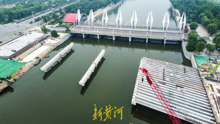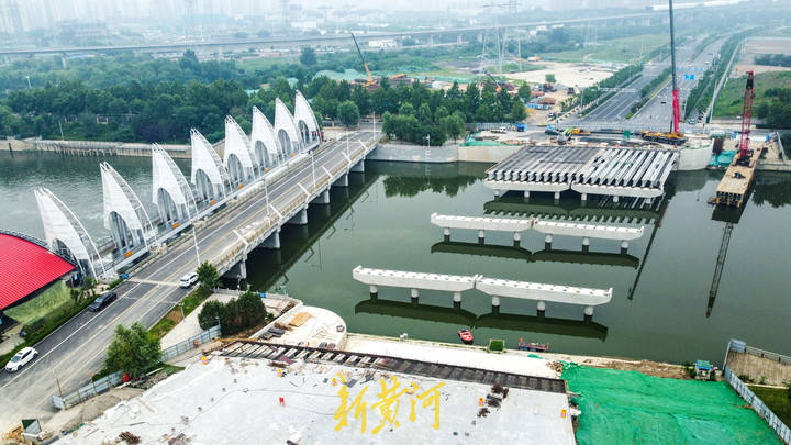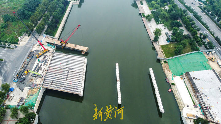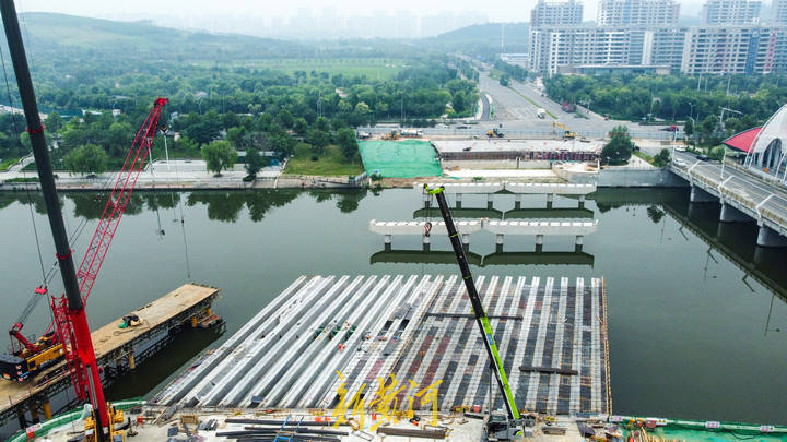 奥体西路北延加速 跨河桥身开架 7月19日,在奥体西路北延跨小清河施工现场,插入河底的桥梁墩柱和承台已经全部浇筑完成,大型箱梁从南北分批逐一吊装,每一个箱梁长约10米,重近百吨,每一跨由22个箱梁组成,箱梁吊装完成后,将在箱梁之间浇筑混凝土形成路面。